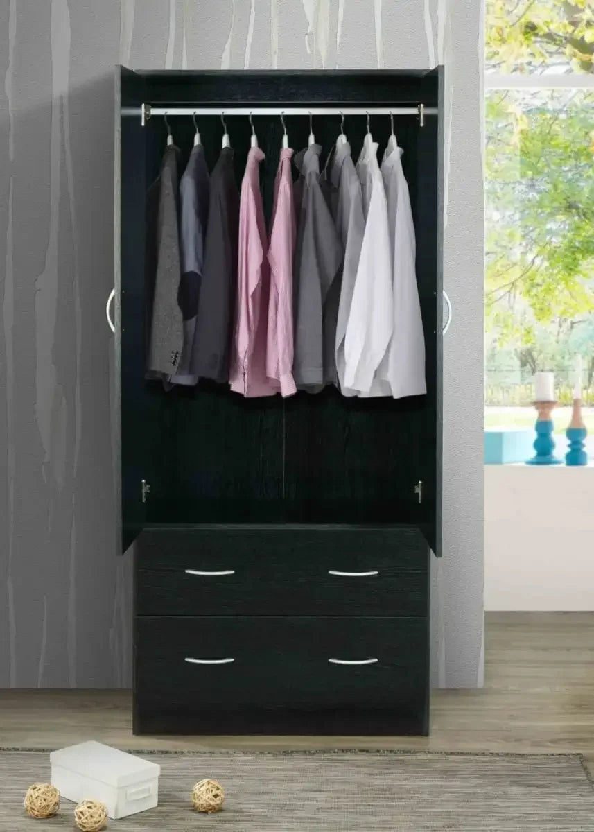 Equipped with two spacious drawers, a hanging rod, and a built-in mirror, this wardrobe provides ample storage for clothing and accessories. Its sleek design makes it an ideal addition to modern bedrooms, offering both organization and elegance in one piece of furniture.